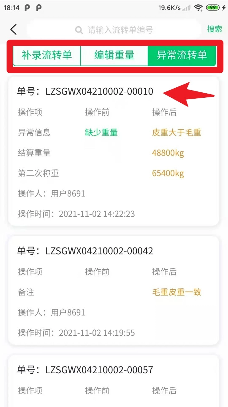 在异常流转单页面,选定具体单号后能够查看缺少重量、皮重异常等问题,系统可以对比前后数据并记录操作时间。