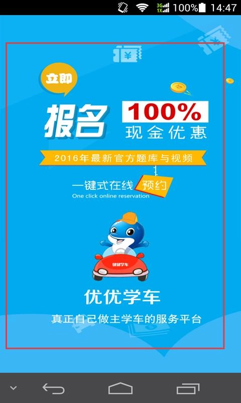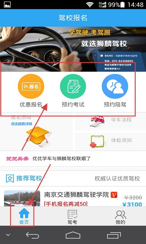 在首页点击【优惠报名】按钮,进入驾校报名页面后,选择自己喜欢的驾校完成报名;此外,还能根据需求点击【预约考试】【预约陪驾】等功能选项。