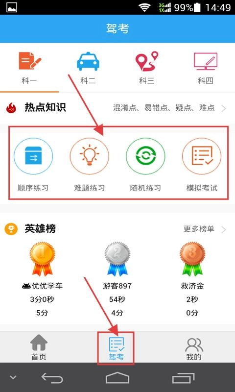 点击页面底部的【驾考】按钮,进入对应的驾考页面后,可根据需求选择【顺序练习】【难题练习】等不同练习模式,进而开展科目一到科目四的习题练习。