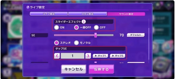 包括音乐、音效、对白。除了滑块调音量外,音乐里还可以选择滑轨键的效果(ON、一部分OFF、OFF),因为滑轨键的时候,音乐演出会变化,这里调的是它的变化量、变化程度。音效里可以选双声道 立体声或单声道,还有击键的效果音,效果音有3组,右边的1和2是试听,对应的就是深蓝和浅蓝的note键。