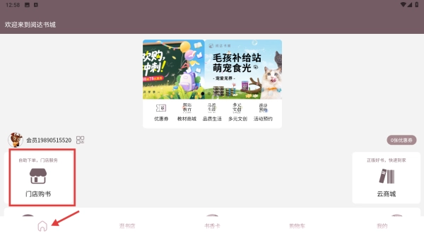 打开阅达书城应用后,在首页不仅能查看会员信息,还能进行门店购书等操作,此外还有毛孩补给站、萌宠食光等活动展示。