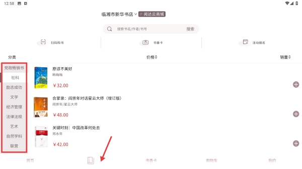 点击底部的“逛书店”选项,就能进入书店页面。在这里,你可以按照社科、文学、经济管理等不同分类来查找书籍,也能够通过搜索书名或者作者名的方式进行查找,同时还能查看书籍的价格、销量等相关信息。