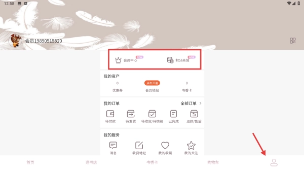 点击底部的“我的”选项,进入个人页面后,即可访问会员中心、积分商城,还能查看我的资产、我的订单、我的服务等相关内容。