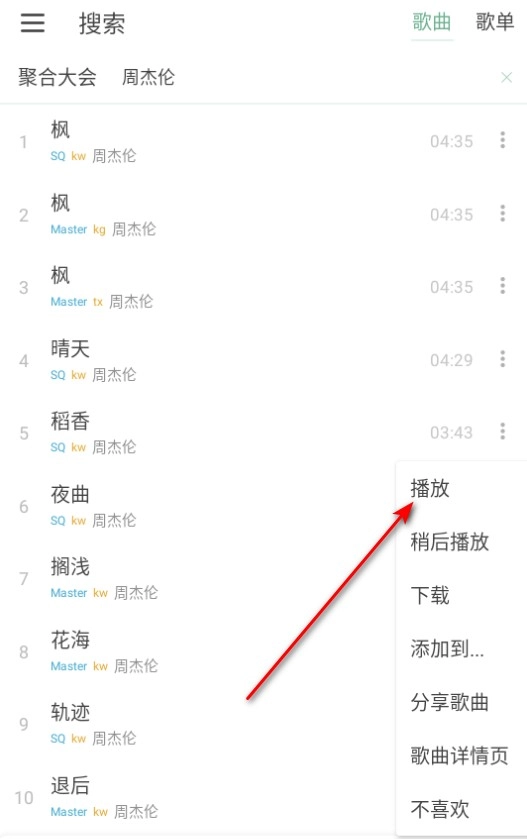 1、搜索到想要的歌曲后,点击歌曲右侧的“···”菜单