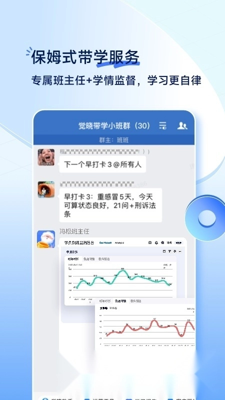 内部班具备如下功能:其学员可获得专属教辅管理服务,教辅人员会根据学员对考点的掌握程度量身定制复习计划,同时系统会实时记录学员的打卡情况并统计学习进度,这样既方便教辅人员对学员进行督促,也便于及时调整复习计划。