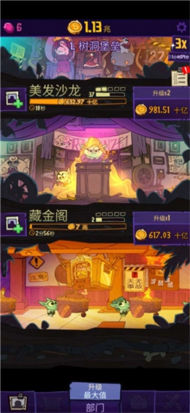 《地牢公司》的人设与玩法虽有创新,但内核仍是比较传统的放置类玩法。玩家要花费金币解锁并升级地牢公司的办公区,而且用奖励宝箱开出的员工必须安排在办公区里,来应对定期上门的审计局人员。有趣的是,审计局的杂兵正是不少童话故事里和恶魔对抗的王子或公主,有些甚至是全副武装的传说勇者。在他们抵达地牢底部前,玩家得靠点击操作消灭他们;当然,要是员工的升级能力足够强,你也能悠闲地观看他们的战斗过程。