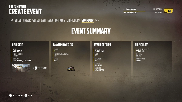 进入自定义比赛模式后,挑选地图HELLRIDE,配置23名对手(所有对手均为割草机LAWNMOWER),将比赛圈数设定为60,对手的AI难度调整为expert级别。玩家自身可以选择割草机,或者其他强度较低、容易损坏的车辆。