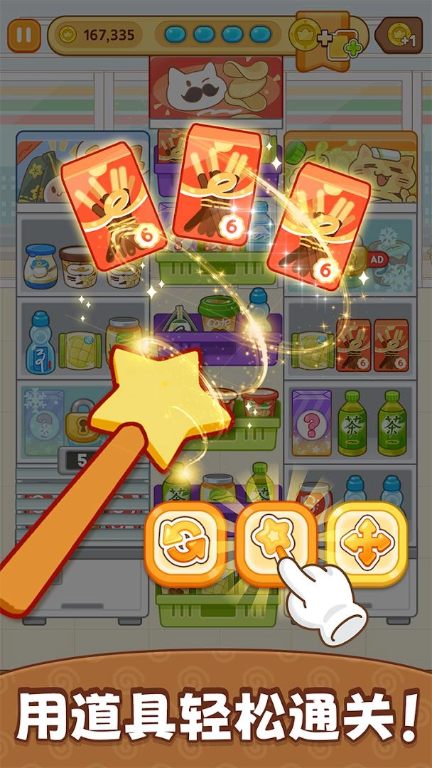 2、进入关卡后玩家需要将三个相同的货物放在同一个货架上消除
