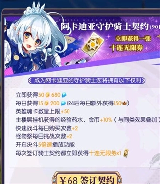 不想猛肝游戏了?那微氪方案可以了解下!新手专属微氪套餐推荐给你:98元的成长基金助你快人一步,30元的冒险者契约开启“金手指”特权,68元的骑士契约能领无限十连抽,还有188元的创世之印可终身受益哦!