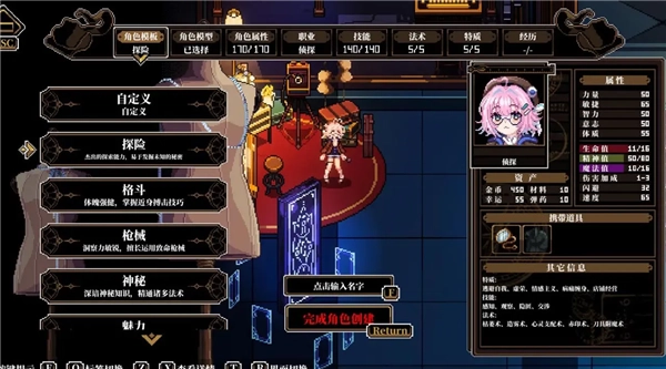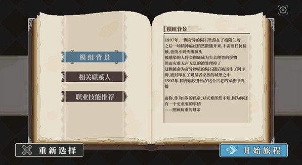 开始有点卡了,这个模组里可选的职业只有学徒,我的角色卡属性是力量60、敏捷30、智力70、意志70、魅力30、体质40