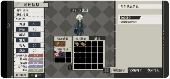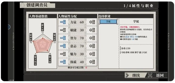 力量、智力和意志这三项属性需要调高,体质保持在40点就行,生命值有8点就足够了;力量达到60的话,徒手伤害刚好能卡在4点这个数值;另外,智力和意志这两个属性会对技能点的获取产生影响。
