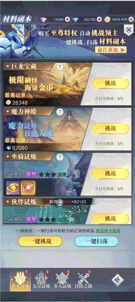 挑战当前已开启的最新章节关卡,能获取冒险评分,该评分将作为冒险榜排名的依据。