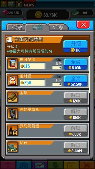 就像现实里炒股一样,我们会依据这类商品的近期走势,来判断它当前价格处于什么位置——要是价格偏低就买入,等涨上去了再卖出。不过游戏里的高级商品得先花金币解锁才能交易,当然,这类商品对应的收益也会更高。另外,每种商品类型我们都有一个交易牌照,这个牌照可以用金币升级,等级越高,交易时能持有的最大股份就越多,这在我们看准行情想大量买入时特别关键。