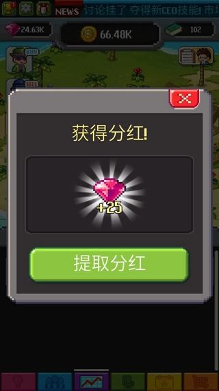 游戏里还有些特殊玩法:挂机时每隔一段时间,屏幕左侧会弹出挂着礼包的邮件,这是这段时间的分红,得手动点击领取,分红通常是宝石,数量还挺可观;另外,经纪人工作时会随机进入暴走状态,此时他们全身冒火,赚钱速度会翻倍。