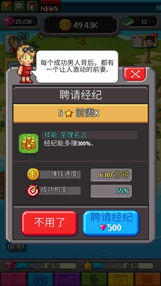 在游戏里攒够足够金币后,优先用来升级经纪人,这样他就能帮我们更快获取金币。不过游戏里除了金币,还有宝石和星星这两种货币,它们需要通过点击来获取——屏幕下方有对应的进度条,点击次数达标、填满进度条后,就能拿到一个宝石和一个星星。宝石可以用来招募高星级经纪人、购买金币,或是兑换一些特殊工具;星星则用于开启神秘宝箱,能从宝箱列表里随机获得一样物品。