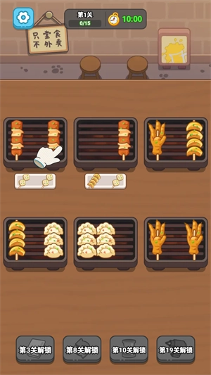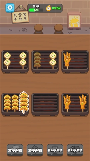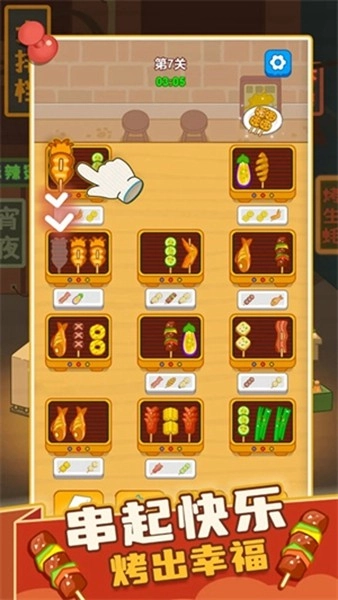 玩家只需把三个相同的串串摆到同一个烤肉盘里,就能完成消除操作啦。