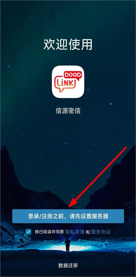 打开信源密信应用,进入登录界面后,用户能够查看隐私政策、服务协议以及数据迁移相关内容,随后点击登录按钮即可。