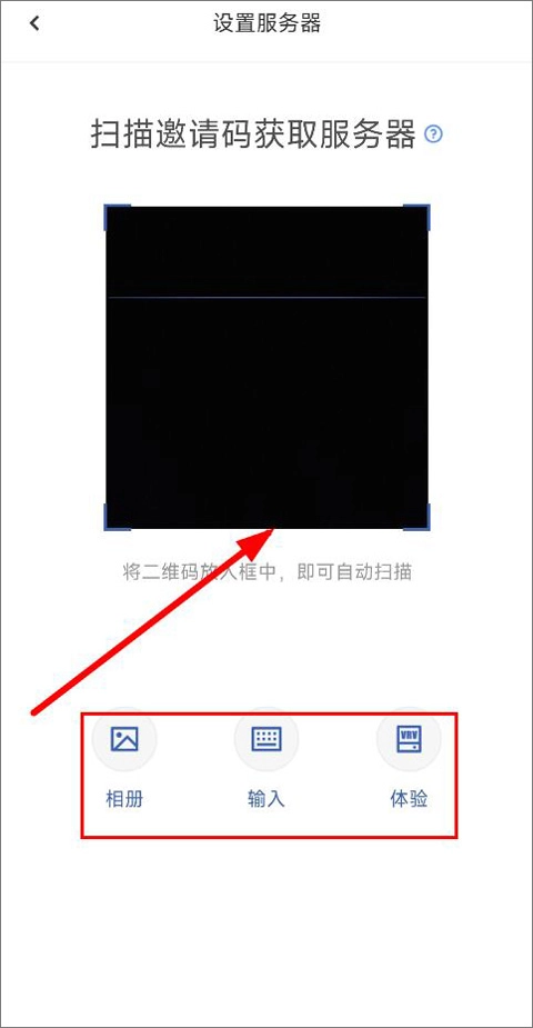进入设置服务器页面后,用户可通过扫描邀请码来获取服务器,同时也能选择拍照、从相册扫描或文字输入等其他方式。