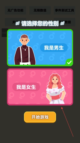 打开游戏后,在初始界面找到“请选择您的性别”的提示,点击“我是男生”或“我是女生”选项来选定性别,之后点击“开始游戏”按钮进入游戏。