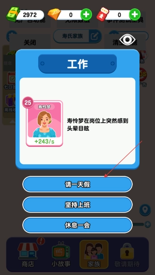 进入游戏后,留意左上角显示的金币数量,当遇到寿怜梦在岗位上突然头晕目眩这类工作事件时,可选择“请一天假”等选项来进行应对。