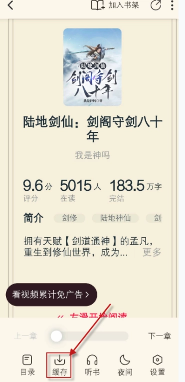 2、在阅读界面点击屏幕中央位置唤出菜单,随后选择“缓存”选项