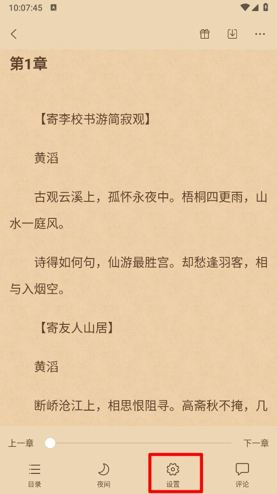 4、然后进入阅读界面点击中间区域呼出菜单,点击\"设置\"