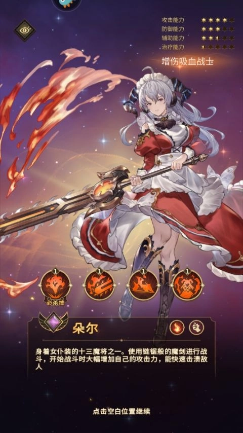 她是十三魔将中的一员,常以女仆装束示人。战斗时她手持一柄链锯形态的魔剑,开战之初便会大幅提升自身攻击力,凭借迅猛的攻势能迅速击溃对手。