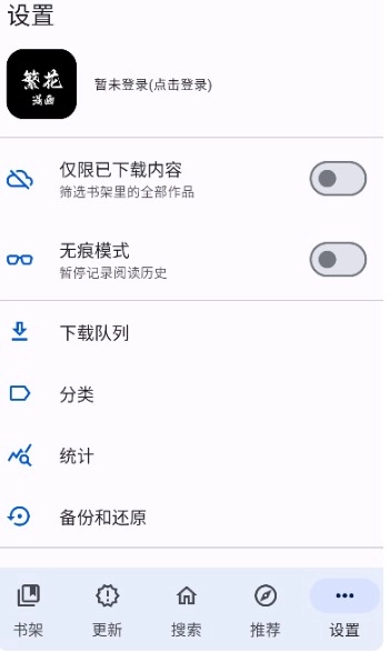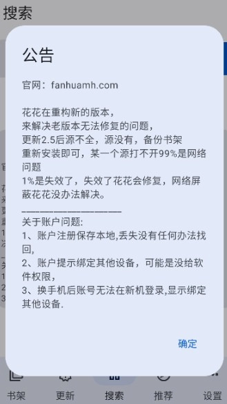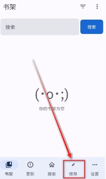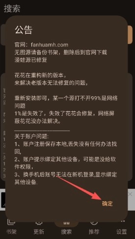 5、正版界面设有五个栏目,依次为书架、更新、搜索、推荐和设置,请务必注意辨别