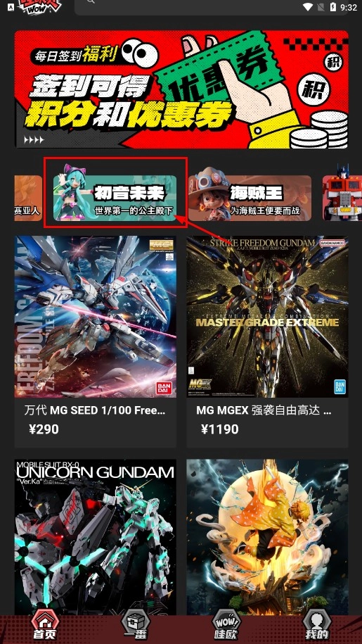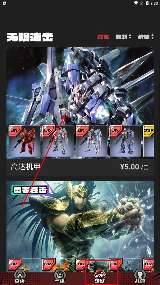 点击底部的【哇欧-功能按钮】,进入对应的页面后,就能查看高达机甲之类的商品了。