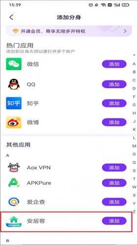 2、接下来,你需要选择你想要添加分身的;在软件中浏览你手机上已安装的列表,找到你想要创建分身的应用,并点击该应用右侧的添加按钮;