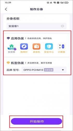 3、在弹出的窗口中,你需要输入你想要为这个分身设置的名称;此外,你还可以选择应用伪装或机型伪装选项;应用伪装是指将分身伪装成其他的图标和名称,而机型伪装则是将分身伪装成其他手机型号;根据你的需求,选择合适的选项,并点击开始制作按钮。