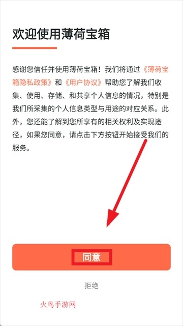 安装薄荷宝箱软件后打开它,在显示“欢迎使用薄荷宝箱”的界面上点击同意按钮,即可进入后续操作步骤。