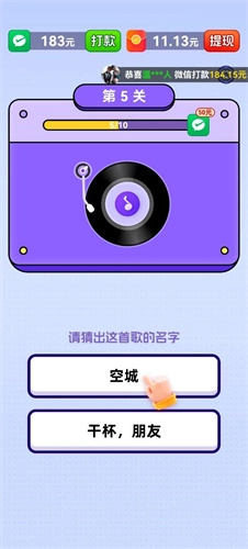 猜歌我最棒是由天津清源互动科技有限公司运营的一款猜歌类赚钱游戏。玩家每猜对一首歌曲,就能获得可观的红包奖励,通过关卡后还能申请提现,红包到账速度极快,通常只需几秒钟。游戏内的歌曲大多是大众熟悉的曲目,难度设置较为亲民,玩家可以轻松参与挑战。