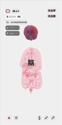 8、屏幕右上角显示的是该人体模型的异常状态,例如现在,她正处于低血钾和低血糖的状态中。