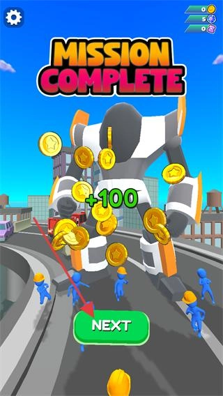 4、在关卡中击败敌方机甲即可判定为胜利,胜利后会获得金币奖励,点击界面下方的NEXT按钮就能进入下一个关卡。