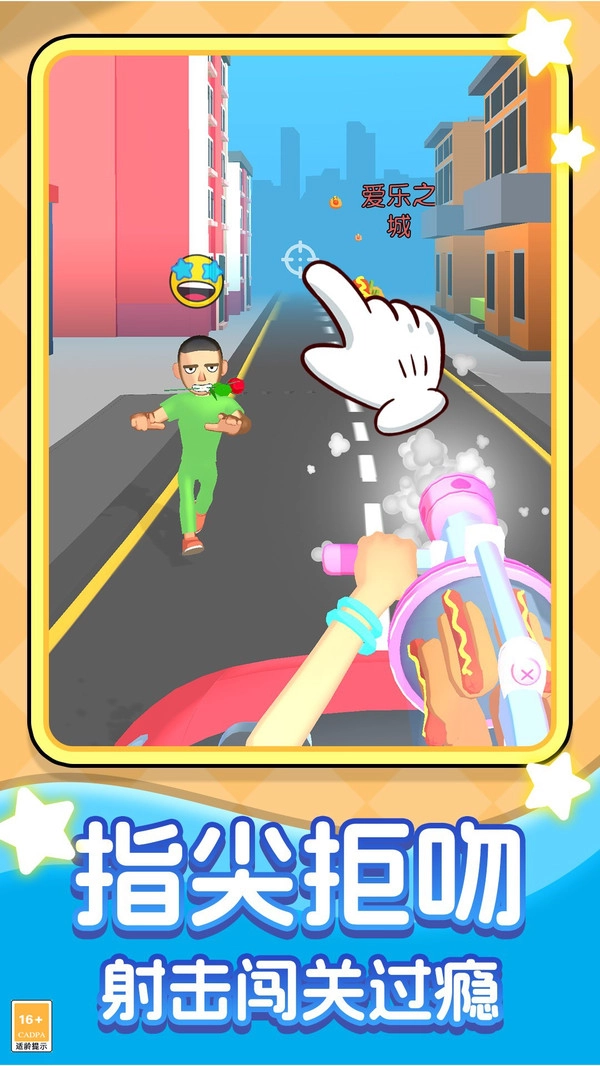 我选择的是“不要亲我”这个选项,点击开始游戏后,操控你的武器去射击沿途遇到的粉丝。