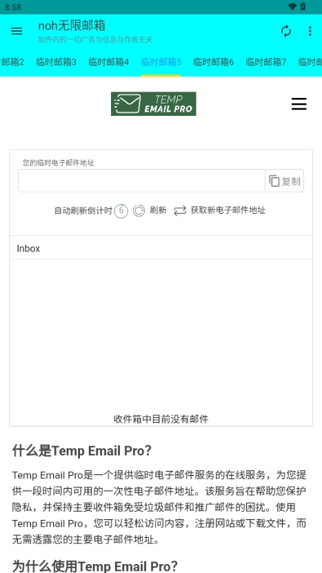 Noh无限邮箱App是一款完全免费的工具,用户能轻松生成临时邮箱地址,不需要支付任何费用。