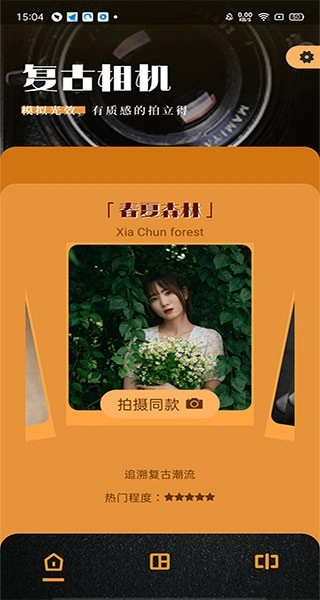 打开软件后,用户可选择拍摄同款,系统提供了古典之韵、旅行、漫画印象、街头韵味、中华照相馆、春夏森林、黑与白、光效斑点等多种风格可供挑选。