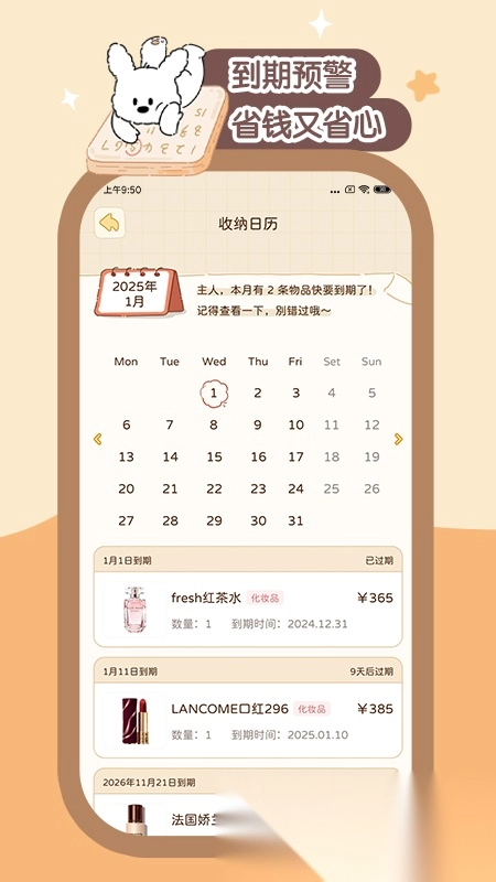 收纳日历能为你呈现清晰直观的到期预警,助力你更全面地掌握所有物品的相关信息。