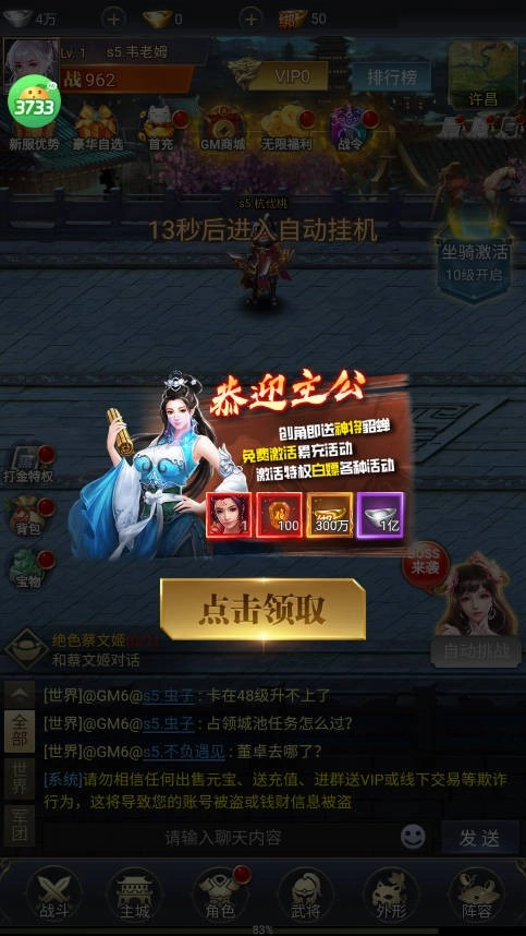 【创角福利】创建角色就送神将貂蝉,还有满V、GM特权、百连招募、300万绑元、一亿银两,激活特权就能免费参与各种活动。
