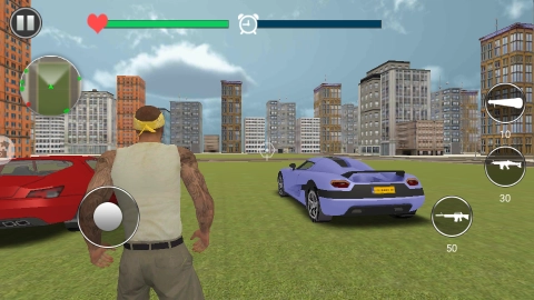 进入游戏后,操控角色在城市里自由移动,留意生命值的变化,借助右侧的武器图标快速应对随时可能出现的危险。