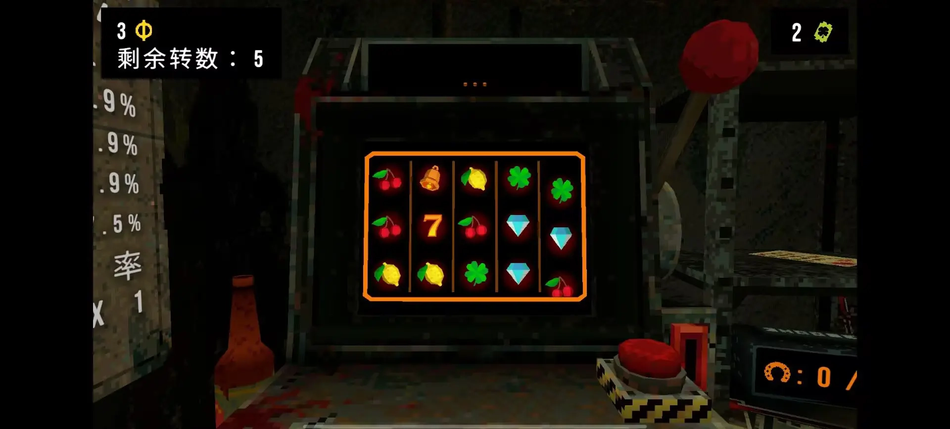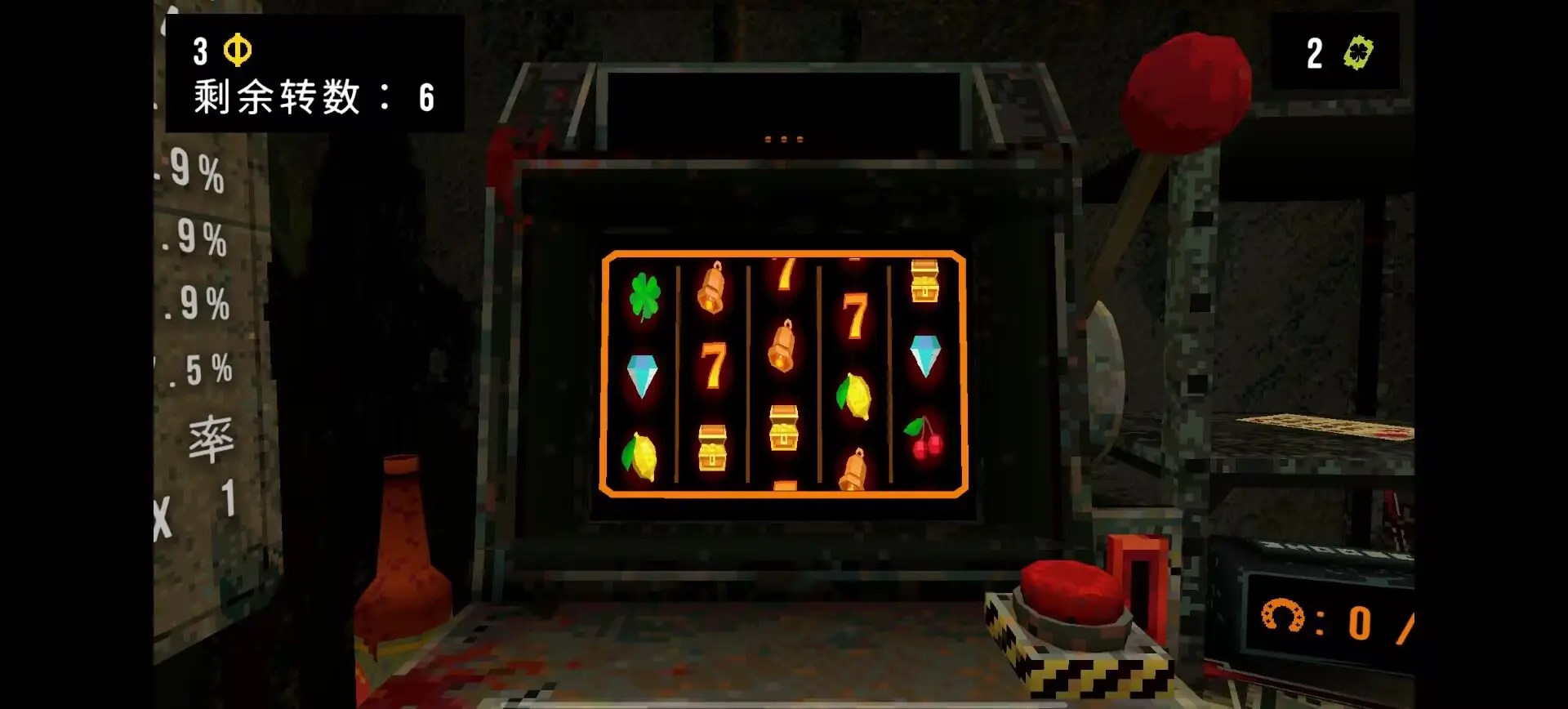 3、场景内分布多个功能区域,左边是老虎机操作区,右边则是商店,可随时用赚来的代币购买补给或特殊辅助道具。