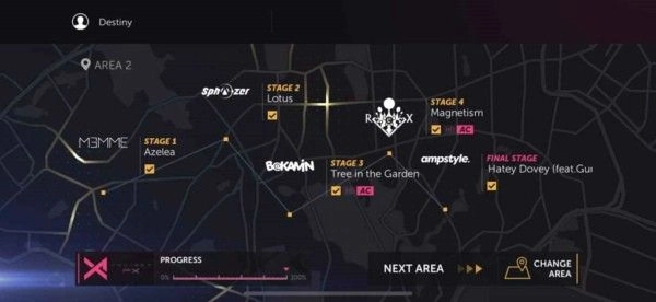 5、屏幕最上方显示的是歌曲进度,当进度条填满时闯关就会结束,通关后系统会依据玩家的分数给出相应评分