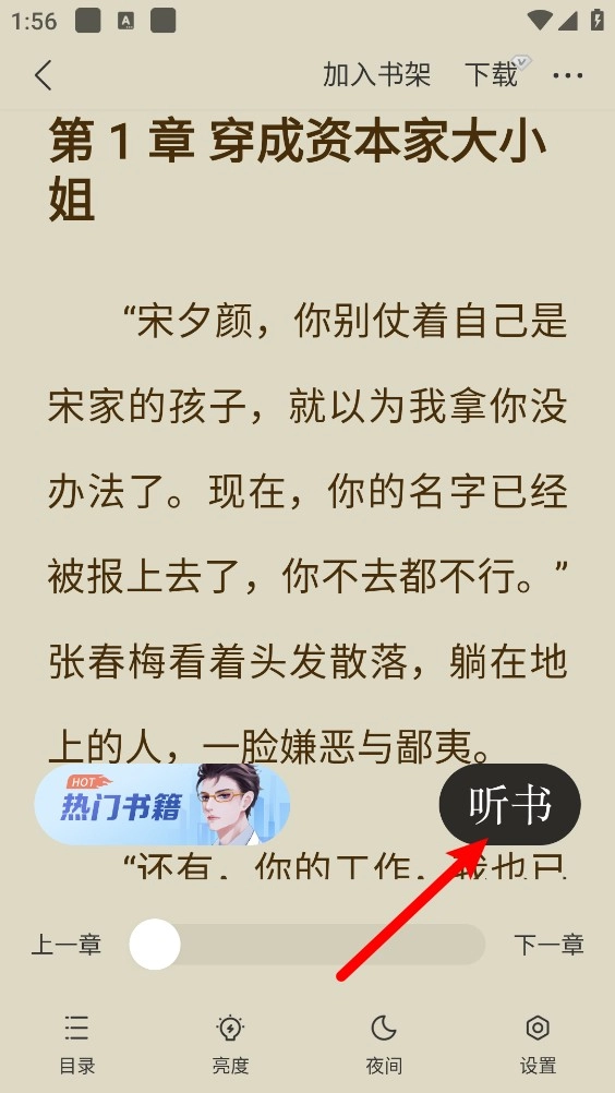 2、进入阅读界面点击中间区域呼出菜单,点击"听"