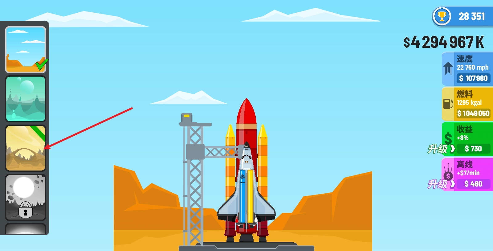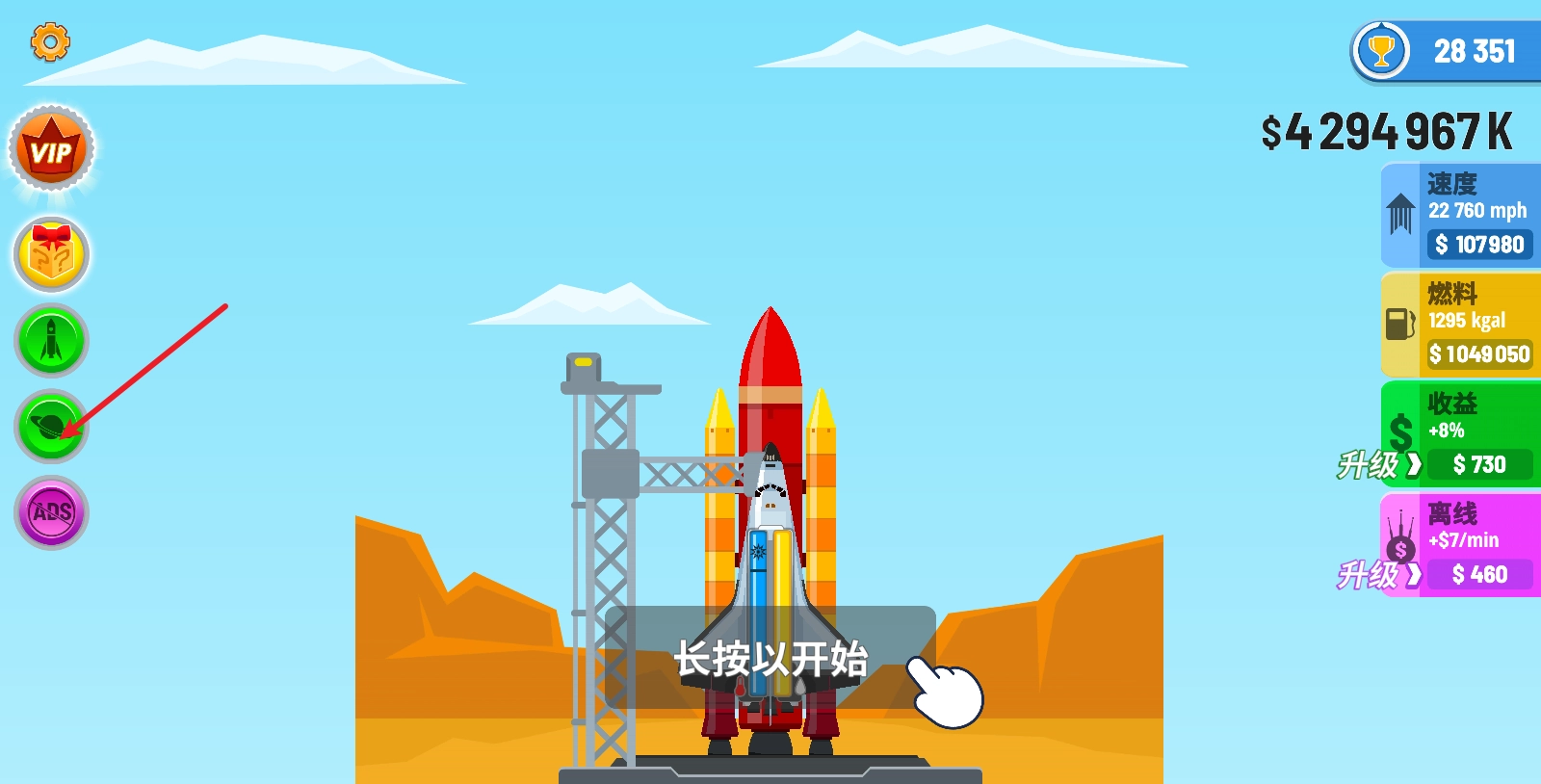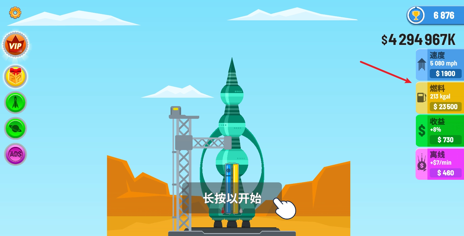 游戏开始前,我们可以在右侧对火箭的各项属性进行升级。