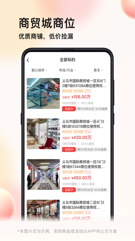 平台上拍卖的资产均以低于市场价的价格起拍,其中包括义乌商贸城的商铺与储藏室,这些资产都在进行低价起拍活动,此外还有一元起拍专区,该专区的活动持续不断。
