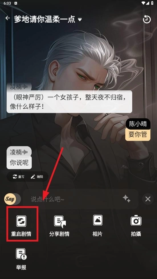 2、选择重启剧情,重启后当前的剧情进度将不会保存。