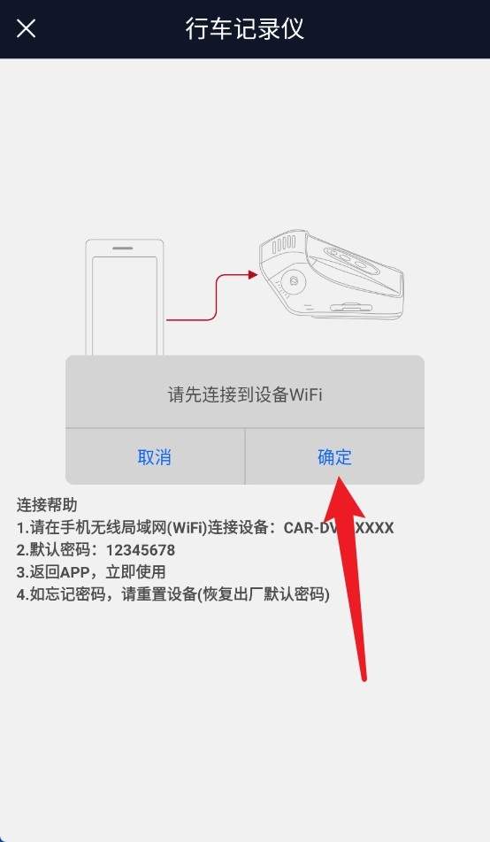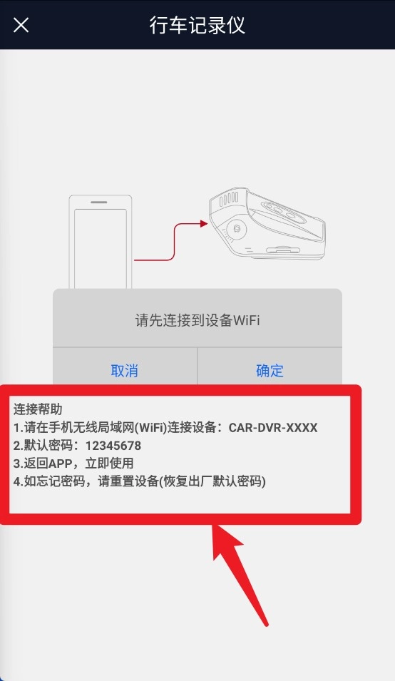 连接帮助里写清楚了设备的WiFi名称、默认密码和连接步骤,请务必仔细阅读。