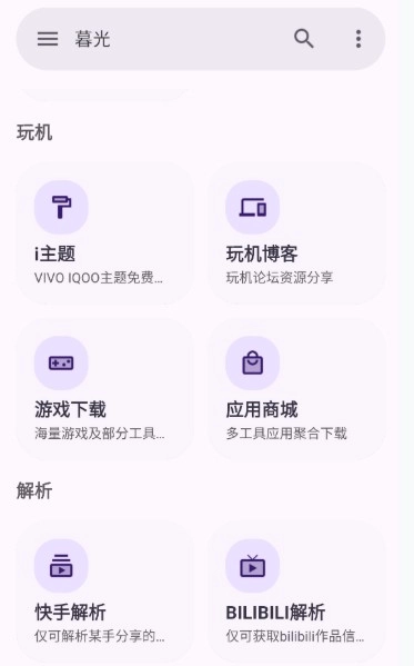 暮光工具箱是一款集成了大量日常实用功能的工具类软件。用户可在此查找头像、壁纸、各类软件等丰富资源,轻松完成头像与壁纸的更换操作,海量资源触手可及。软件资源板块涵盖动漫、漫画、小说、音乐等常用分类,所有软件均可免费安装体验。此外,软件支持B站视频链接解析功能,还包含生活各领域的多种实用工具,操作便捷易用。