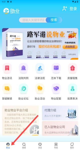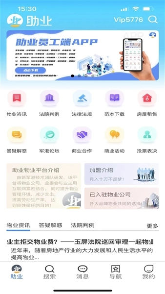 首页采用明快的色彩设计,配备物业资讯、法律法规等丰富的功能模块,助业标识清晰醒目,便于用户便捷获取各类物业相关服务。